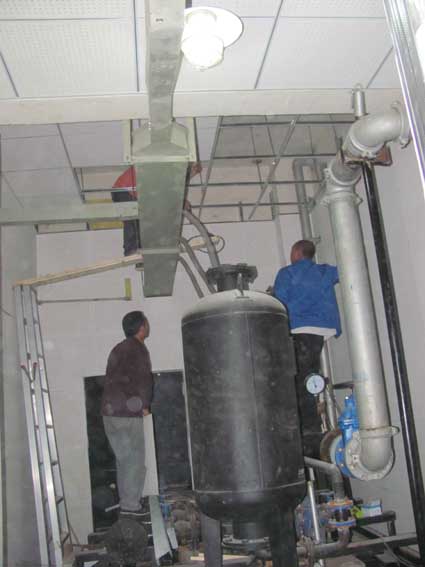 成都.锦城一期有一个水泵房,高、中、低区集中一起,水箱房2个,管道错落其间,位于9栋一、二、三单元楼下,水泵机组运行时产生的低频振动噪声顺着四周墙壁、柱头向楼上传递,一直到七楼,干扰业主的正常休息,一楼草坪有10个窨井盖,受动力引流设施影响,窨井盖内传出不规则中低频噪声,一直传到七楼,严重影响业主休息,受该公司邀请,我们成都鼎三丰环保工程有限公司声学工程师与甲方工程师对现场进行了实际勘察,在地下室机房里感觉噪声并不特别大,但地面、墙体发麻,基础振动明显,业主反映上午午7:00~8:00,夜间0点-1点噪声明显,一直影响到3楼住户,经检测:9栋一单元业主家里主卧中低频噪声达到45-63分贝,居民意见非常大。 水泵机组的振动频率沿着楼板、墙壁向楼上传播,导致楼上1—7楼业主房间墙壁、地板、天花板、柱头振动明显,房间内低频噪声嗡鸣声非常严重,虽然A声级测量为45-63分贝,好像超标不是太多(标准为35分贝),同时一楼地面10个窨井盖内传出不规则中低频噪声,一直传到七楼,严重影响业主休息,此类噪声频率低,分贝数不高,但对人体影响较大,由于噪声的频率集中在150赫兹,对人体大脑产生大量的@电波,引起人体烦恼度增大。 对于成都.锦城一期,我们认为水泵基础没有进行精确减震、水压管道水流声共振、水箱进水脉冲等噪声是影响楼上业主家里声环境的主要因素,其次一楼草坪上的10个窨井盖发出不规则中低频噪声也是原因之一,为此我们确定我们的施工方案与降噪方案。 1、在水泵机组和稳压罐下根据振动频率设计安装我公司自行生产复合减振台,以切断水泵运行时的振动传递到固体机构。 经过我们工程技术部连续15天施工,反复调试之后,该降噪工程取得优异的效果,业主家客厅降到27分贝,卧室降到26分贝,厨房降到26分贝,达到国家1级声环境。 现场照片: