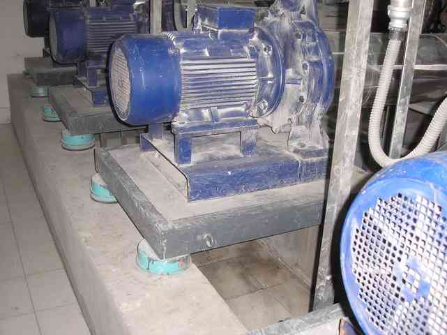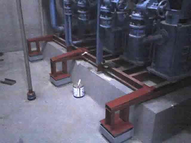 3)机组振动噪声治理:水泵运行中由机组振动引起的,是一个技术难点,将振动源与承载物或地基之间的刚性连接,改为弹性连接,利用弹性装置的隔振作用,减弱振动源与承载物或地基之间的能量传递,降低振动对环境的影响并通过基座传播的固体声污染是治理中的主要问题,只有针对结症所在,认真计算,合理使用水泵机组专用复合隔振台,才能达到治理目的。