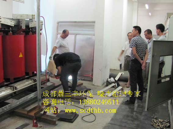 针对水城之星小区变电机组噪声振动产生原理和特点,我们成都鼎三丰环保工程有限公司工程师与业主方工程师对现场进行了实际勘察,在一楼变电机房里感觉噪声A声级并不是特别大,但地面发麻,基础振动明显,楼上由于固体结构传声引发的低频噪声很明显,一直影响到6楼,居民意见非常大。我们认为机组基础没有进行精确减震与机房内低频噪声共振是影响楼上业主家里声环境的主要因素,为此我们确定我们的施工方案与降噪目标。