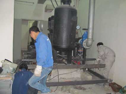 成都.锦城一期有一个水泵房,高、中、低区集中一起,水箱房2个,管道错落其间,位于9栋一、二、三单元楼下,水泵机组运行时产生的低频振动噪声顺着四周墙壁、柱头向楼上传递,一直到七楼,干扰业主的正常休息,一楼草坪有10个窨井盖,受动力引流设施影响,窨井盖内传出不规则中低频噪声,一直传到七楼,严重影响业主休息,受该公司邀请,我们成都鼎三丰环保工程有限公司声学工程师与甲方工程师对现场进行了实际勘察,在地下室机房里感觉噪声并不特别大,但地面、墙体发麻,基础振动明显,业主反映上午午7:00~8:00,夜间0点-1点噪声明显,一直影响到3楼住户,经检测:9栋一单元业主家里主卧中低频噪声达到45-63分贝,居民意见非常大。 水泵机组的振动频率沿着楼板、墙壁向楼上传播,导致楼上1—7楼业主房间墙壁、地板、天花板、柱头振动明显,房间内低频噪声嗡鸣声非常严重,虽然A声级测量为45-63分贝,好像超标不是太多(标准为35分贝),同时一楼地面10个窨井盖内传出不规则中低频噪声,一直传到七楼,严重影响业主休息,此类噪声频率低,分贝数不高,但对人体影响较大,由于噪声的频率集中在150赫兹,对人体大脑产生大量的@电波,引起人体烦恼度增大。 对于成都.锦城一期,我们认为水泵基础没有进行精确减震、水压管道水流声共振、水箱进水脉冲等噪声是影响楼上业主家里声环境的主要因素,其次一楼草坪上的10个窨井盖发出不规则中低频噪声也是原因之一,为此我们确定我们的施工方案与降噪方案。 1、在水泵机组和稳压罐下根据振动频率设计安装我公司自行生产复合减振台,以切断水泵运行时的振动传递到固体机构。 经过我们工程技术部连续15天施工,反复调试之后,该降噪工程取得优异的效果,业主家客厅降到27分贝,卧室降到26分贝,厨房降到26分贝,达到国家1级声环境。 现场照片: